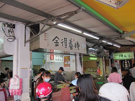 巷口則是人潮擁擠的"金得春捲",說是春捲其實是潤餅捲,老闆捲好後會用鐵板稍微烤一下,因此就算買了晚上吃,皮也不會爛爛的~(第二天我們又跑來買了12個揹回台北,哈)因為之前看電視有介紹這家,所以也買了幾個想驗證看看到底有多好吃! 每份35元,若買2個以上老闆會用紙盒裝,避免壓到扭曲~
