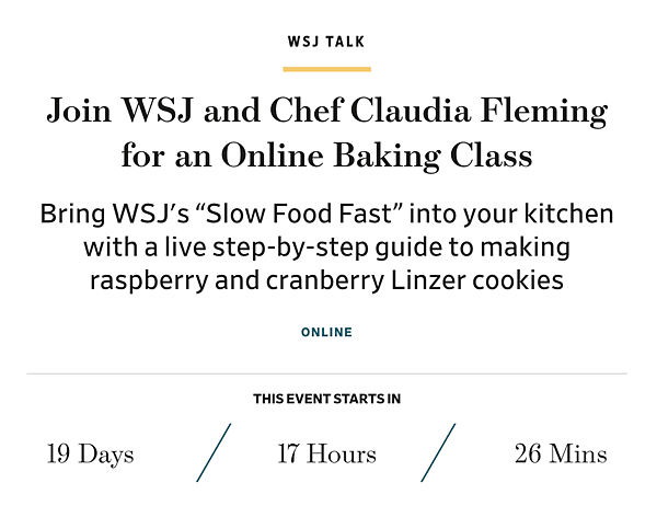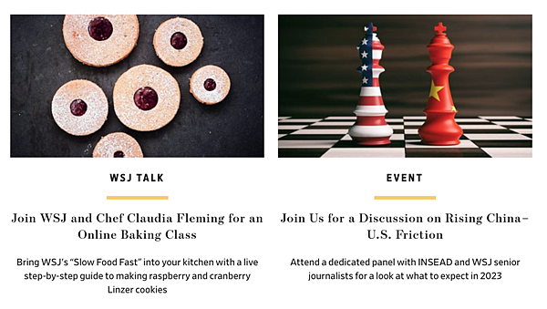 WSJ+全球活動I這個服務是透過風傳媒訂閱才有附送的,我自己常參與的是老外主廚線上教學,學一些生活用語,另外也有科技主題、女性創業或是投資的議題論壇,時不時會有線上小雜誌可以下載,例如:帶你線上逛法國的酒莊,或是抽獎活動,例如:日本京都藝術展的門票、中國農曆年的限量紅包...等等。