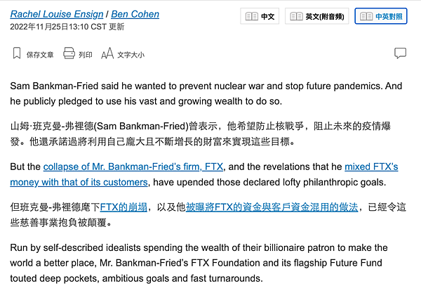 文章中翻英I透過風傳媒訂閱,可以閱讀華爾街日報中文版、英文版還有日文版,如果是想要快速了解世界正在發生的大事,可以切到中文版。但如果是想跟我一樣當作進修的工具,可以在中文版中有提供中翻英服務的文章來閱讀。這類型文章,有提供一句句的中英比對(見下圖),跟整篇文章翻譯比較來,這種版面比較能加深文法印象,看到新的名詞也能立刻了解該怎麼使用。